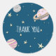 Merci mignon stickers avec des planètes roses et des étoiles jaunes sur un bel arrière - plan bleu. L'illustration semble être en trois dimensions, mais ce n'est qu'une impression. Illustré et dessiné par Patricia Alvarez.
