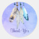 autocollant Merci avec un motif d'aquarelle américain. Un design aquarelle avec quatre plumes délicates et douces perlées ensemble accrochées à la bordure supérieure. L'arrière - plan est une douce texture d'aquarelle bleu violet. Un motif tribal avec un thème de style amérindien.