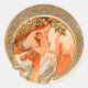 Poésie d'Alphonse Mucha. Les couleurs pâles sont sobres et naturelles. La femme, belle, aux cheveux longs et flottants, est entourée de fleurs ornées. Elle est la personnification de la poésie. Sa robe flottante est peinte dans les tons bleu pâle et vert qui rappellent le ciel et la terre. Elle repose sur l'arrière - plan dorée qui se marie avec ses cheveux longs et dorés. La femme regarde la campagne, la tête couronnée d'une branche de laurier, symbole de poésie et de divination. Elle semble être dans la contemplation en regardant le paysage, presque comme si elle était assise sur une balançoire au-dessus de la Terre. Pensif, et sentiment, comme la muse regarde toute l'activité ci-dessous, inspirant les poètes qui nous apportent leurs mots.