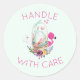Un autocollant qui dit "manier avec soin". Conçu avec une jolie aquarelle illustration d'un oeuf assis à l'intérieur d'un panier en osier. Décoré de rubans, arcs, fleurs et petits coeurs aussi. Un flamant rose et un lapin lapin blanc se tiennent de part et d'autre en regardant la cargaison précieuse.