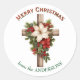 At the center of this Christmas envelope sealer sticker is the image of a wooden cross covered with a red and white poinsettia bouquet. At the top is red stylized text that says "Merry Christmas". At the bottom is your custom signature in green text. Festive for packages, too.