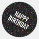 Arc-en-ciel Motif Classic Round Sticker - Ces autocollants sont dotés d'un motif pois arc-en-ciel et des mots "Joyeux anniversaire" en gras sur un arrière - plan noir.