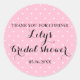 Autocollant rond personnalisé "Merci pour venir" pour une douche nuptiale. Cet autocollant sucré présente une élégante écriture noire et un arrière - plan rose pastel avec des pois blancs. Vous pouvez le personnaliser avec votre nom, texte personnalisé et date de la douche nuptiale. Vous pouvez même modifier la couleur du texte et le style de police à l'aide de l'option personnaliser. Parfait pour une douche nuptiale !