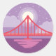 Un pont brillant dans les tons rose rouge contre un ciel nocturne violet onirique, une pleine lune lumineuse brille derrière des nuages dérigeants tandis que son reflet brille à travers l'eau calme en contrebas.