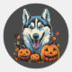 Sticker Rond Pop Art Smilling Husky Chien avec Halloween Citrou