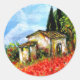 Paysage toscan, coloré, vibrant, beauté expressive de la campagne italienne et champs de pavot rouge, belle flore estivale en vert clair, jaune, marron, bleu, couleurs blanches, prés, champs de fleurs, cyprès et oliviers, ancienne ferme rustique sous le ciel bleu et les nuages blancs.Peinture acrylique sur toile.