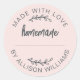 Autocollant fait maison rose blush avec typographie noir cassé et design de lettrage manuscrit. Parfait pour sceller les pâtisseries, les pots de confiture, les biscuits, le pain, les boîtes à tarte, l'emballage des petites entreprises, les faveurs de fête et les cadeaux faits à la main. Comprend une ligne de nom personnalisable, ce qui le rend idéal pour les boulangers à domicile, les créateurs et les petites marques à la recherche d'une finition douce et propre. Personnalisez facilement avec votre nom ou les détails de votre boutique.
