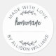 Autocollant fait avec amour et écriture blanche avec une typographie noir cassé et un design de lettrage manuscrit. Parfait pour sceller les pâtisseries, les pots de confiture, les biscuits, le pain, les boîtes à tarte, l'emballage des petites entreprises, les faveurs de fête et les cadeaux faits à la main. Comporte une ligne de nom personnalisable, ce qui le rend idéal pour les boulangers amateurs, les artisans et les petites marques à la recherche d'une finition propre et soignée. Personnalisez facilement avec votre nom ou les détails de votre boutique.