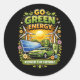A bright eco-themed illustration promotes renewable energy with solar panels, wind turbines, and an electric car.
