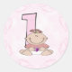 Adorable bébé tenant un cadeau juste pour elle. Arrière - plan de défilement rose avec un grand numéro un!