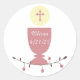 Un joli autocollant Première Communion a un chalice rose avec Eucharistie et croix sur une vigne marron avec des fleurs roses. Personnalisez avec le nom et la date si vous le souhaitez. Coordonner les éléments disponibles.