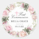 De magnifiques roses roses rousses encadrent cet élégant joint d'enveloppe de la Première Sainte Communion. Une croix rose douce orne également cet autocollant. La première communion est écrite dans une belle police de caractères traditionnelle. Le nom de notre fille est écrit en majuscules avec la date ci-dessous. Vous pouvez également l'utiliser comme sceau de faveur.