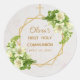 Cet élégant autocollant de première communion sainte géométrique floral, recommandé pour une première invitation à la communion sainte, a un cadre d'or irrégulier avec bouquets de fleurs de lis blancs vers le haut et vers le bas gauche sur deux hexagones d'or qui superposent sur un arrière - plan de marbre blanc, avec une croix d'or en haut. Le nom de l'enfant est écrit dans un élégant script calligraphique. Tout le texte a une couleur jaune doré, comme le cadre doré. Le bouquet vintage de fleurs à lys blancs provient d'une carte postale vintage de Bertha Maguire (1862-1910), désormais dans le domaine public.