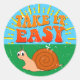 Le message de l'escargot est : prenez-le facilement. Caractère de dessin animé original avec sunburst et texte super. Des autocollants personnalisés avec effet déprimé appliqués à l'image. Idée cadeau.
