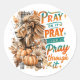 Design paisible et coloré avec une scène automne/automne avec tête de lion majestueuse, citrouilles et fleurs automne. Le texte inspirant et coloré dit : "Priez dessus, priez dessus, priez à travers". Ce design est disponible sur une grande variété de produits.