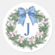 Cet autocollant de Noël a une couronne de Noël avec des arcs roses et bleus. Vous pouvez personnaliser avec votre initiale et un nom.