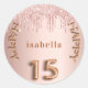 Un autocollant pour une Quinceañera girly et glamour, fête du 15e anniversaire. Un faux rose or à l'apparence métallique arrière - plan avec un élégant faux rose or et parties scintillant rose gouttes, look goutte à goutte de peinture. Le texte : Happy et numéro 15 est écrit avec une police de style ballon doré. Personnalisez et ajoutez un nom.