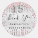 Moderne, élégant et glamour pour une Quinceañera fille, 15e anniversaire fête. Un arrière - plan faux argenté, décoré de poussière de parties scintillant rose et faux argent. Avec le texte : Merci. Personnalisez et un nom. Le numéro 15 est écrit avec une police de style ballon, script.