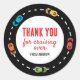 Cet autocollant comporte une piste circulaire avec des voitures de course colorées avec un message de remerciement personnalisable. Un accessoire d'anniversaire coloré et mignon pour une fête d'anniversaire sur le thème de la voiture de course !