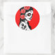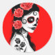This Day of the Dead inspecred design fea beautiful woman with sugar skull patterns on her face. Three roses appear dans le jet black hair with two more roses tattooed on her pauvre. The girl is standing sideways with her head turned slightly towards the viewer. La pure white skin really stand out against the black hair and dress as well as the bright red background. This unique design is a stunning representation of this Day of the Dead woman.