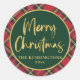 Stickers Rouge Tartan Plaid Gold Script Joyeux Noël Round Stickers avec notre typographie moderne de Joyeux Noël en faux or sur un plaid festif arrière - plan plaid de rouge, vert, blanc, et des bandes de plus d'or, mis à un angle douillet.