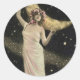 Photo vintage montrant une belle dame en robe longue debout dans une pose dramatique avant une lune croissant.