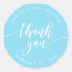 autocollant Merci avec les mots "merci" dans un script de relaxation cursive en blanc contre un arrière - plan bleu pastel. Personnalisez-le en remplaçant le texte de l'espace réservé. Pour plus d'options comme changer la police et sa taille/couleur, développer la courbe /contrat ou l'espacement entre les lettres cliquez sur le bouton "Personnaliser". *Veuillez noter que le filigrane Zazzle qui apparaît dans l'aperçu du zoom n'apparaîtra PAS sur le produit imprimé final. © Bois de rose et agrumes