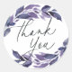 Des autocollants botaniques élégants pour vos cadeaux d'événement, cartes de remerciement ou matériel professionnel comportent 'merci' dans une typographie de calligraphie manuscrite, entourés de feuillage et de branches aquarelles luxuriants dans des nuances de violet et de bleu. Conçus pour coordonner avec notre collection d'invitations de mariage botaniques à feuillage abondant violet.