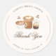 Montrez votre appréciation avec ce sticker rond classique de remerciement de mariage thème café. Avec un design inspiré du café, ce sticker est parfait pour ajouter une touche spéciale à vos cartes de remerciement, faveurs ou sacs cadeaux. Une façon amusante et élégante de remercier vos invités d'avoir assisté à votre mariage, rendant votre célébration encore plus mémorable.