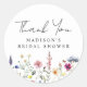 Autocollants de remerciement élégants pour une fête de mariage avec une bordure inférieure de fleurs sauvages et de feuillage aquarellés dans des nuances de rose, jaune, violet, bleu et vert sur fond blanc. Personnalisez les autocollants de remerciement de fête de mariage avec le nom de la future mariée. Les autocollants personnalisés de fleurs sauvages sont parfaits pour les fêtes de mariage de printemps et d'été.