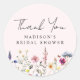 Autocollants de remerciement élégants pour baby shower de mariage avec une bordure inférieure de fleurs sauvages aquarelles et feuillage dans des nuances de rose, jaune, violet, bleu et vert sur un fond rose blush. Personnalisez les autocollants de remerciement de baby shower de mariage avec le nom de la future mariée. Les autocollants personnalisés de fleurs sauvages sont parfaits pour les baby showers de mariage printaniers et estivaux.