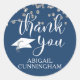 Confettis pailletés argentés et écriture script chic THANK YOU avec le nom du diplômé en blanc sur un fond bleu changeable pour coordonner avec les couleurs du thème de l'école ou de la fête. Utilisez comme autocollants de faveur de fête de fin d'études ou sceaux de remerciement sur les enveloppes de papeterie. Contactez le concepteur via Zazzle Chat ou makeitaboutyoustore@gmail.com si vous souhaitez que ce design soit modifié, sur un autre produit ou si vous souhaitez des articles coordonnés.