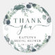 Autocollants de remerciement pour baby shower de mariage conçus avec des feuilles d'eucalyptus vert sauge aquarelle et vert bleu poussiéreux, feuillage et verdure chic écriture manuscrite et personnalisés avec le nom de la future mariée et la date. Contactez le concepteur via Zazzle Chat ou makeitaboutyoustore@gmail.com si vous souhaitez que ce design soit modifié, sur un autre produit ou si vous souhaitez des articles de coordination.