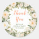 Belle autocollant de remerciement avec un parapluie blanc et des arrangements floraux pêche et crème. Parfait pour une douche de mariée. Les mots peuvent être modifiés pour répondre à vos propres détails ou exigences