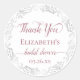 Ces magnifiques autocollants sont parfaits pour remercier les invités lors d'une fête de fiançailles. Le design présente une calligraphie élégante de couleur rose poussiéreuse ou mauve sur fond blanc classique avec une bordure de dentelle florale argentée à effet de feuille d'argent. Le texte indique Merci, avec de la place pour le nom de la future mariée et la date.
