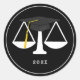 Autocollants créatifs pour la remise des diplômes de la faculté de droit pour les cadeaux de remise de diplôme d'avocat, étiquettes de faveurs de fête et sceaux d'enveloppe avec une balance de la justice portant un chapeau de graduation noir et or. Pour personnaliser, modifiez le texte.