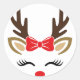 Illustration fantaisiste d'un visage de rennes, avec de grands yeux fermés et expressifs ornés de longues cils. Le renne a un nez rouge vif et un joyeux arc rouge sur la tête, en contraste avec les bois bruns mous.