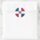 Drapeau de la République Dominicaine. Le drapeau de la République Dominicaine est recouvert d'une croix blanche centrée qui s'étend sur les bords et divise le drapeau en quatre rectangles, les plus hauts sont bleus (côté levis) et rouges, les plus bas sont rouges (côté levrette) et bleus. Une grande armoiries ornées d'un bouclier au design de drapeau et supportées par une branche de laurier de baie (à gauche) et une fronde de palmier (à droite) est au centre de la croix ; au-dessus du bouclier, un ruban bleu affiche la devise nationale : Dios, Patria, Libertad (Dieu, Patrie, Liberté). Sous le bouclier, les mots República Dominicana apparaissent sur un ruban rouge. Au centre du bouclier, flanqué de trois lances (deux d'entre elles tenant des bannières dominicaines) de chaque côté, est une Bible avec une petite croix au-dessus et dit être ouvert à l'Évangile de Jean, soit au chapitre un ou chapitre 8, verset 32, qui dit Y la verdad nos hará libre (Et la vérité vous rendra libres).