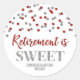 La retraite est une étiquette de faveur douce autocollante avec motif de confetti rouge et argent.