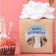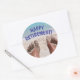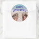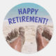 Autocollant drôle de retraite heureuse avec photo de pieds sablonneux sur la plage est idéal pour une fête de retraite ou un album photo.