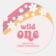 Autocollant d'invitation Wild One d'inspiration rétro avec marguerites de style 70's et polices et couleurs boho.