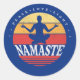 Septembre est le mois national du yoga. Célébrez avec ce design rétro coucher de soleil avec une personne méditant et les mots "paix, amour, lumière" et "namaste".