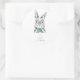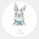 Un joli autocollant d'équipe révélant un adorable lapin noir et blanc dessiné à la main, un garçon qui dit "He Team" en écriture bleue et typographie sans serif. Personnalisé avec les détails de la fête ci-dessous. Copyright Invitations élégants, tous droits réservés.
