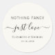 Un sticker chic crème légère pour vos invitations de mariage, faveurs et cartes de remerciements avec "Nothing Fancy Just Love" présenté dans un mélange de lettrage simple et un script élégant avec des swashes, et vos noms et date de mariage ou de réception dans la typographie serif classique.