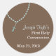 Ce design d'autocollant rond de communion contemporain présente un chapelet bleu sur un arrière - plan marron chocolat. Personnalisez cet autocollant avec vos propres détails et votre propre libellé. Graphique par Jessicaweible.com
