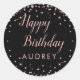 Elégante moderne Rose étincelante Parties scintillant d'or noir Joyeux Monogramme Anniversaire Personnalisé Enveloppe ou emballage cadeau Seal (Merci sticker). Ce design féminin de fête d'anniversaire féminin adulte avec un élégant script de calligraphie "Joyeux anniversaire" écrit à la main et cadre de parties scintillant en diamant d'or rose sur arrière - plan noir. Personnalisez le nom du monogramme. Idéal pour une fête d'anniversaire féminine adulte, il saisit parfaitement l'essence d'une fête d'anniversaire rose moderne en or et en parties scintillant rose rousse pétillante.