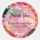 Un autocollant élégant avec des roses rayées roses et blanches qui fleurissent dans cette photographie florale d'art fin, avec Merci en lettres cursives, et de la place pour plus d'informations en lettres bloc vintage sur un fond translucide.