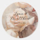 Sticker rond classique de mariage d'été Roses élégant conçu avec des roses d'été sur un arrière - plan de crème et de taupe. Le texte comprend : Les prénoms et la date du Mariage de la mariée et de la mariée. Pour personnaliser, insérez simplement vos détails dans notre modèle facile, en remplaçant l'exemple de texte. N'oubliez pas de consulter l'ensemble de la collection Élégante Mariage Roses d'été pour les cartes et accessoires correspondants.