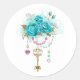 Clé d'or antique aux roses turquoise tendance décorée de feuilles d'or blanc et de perles rose et bleu. Couleur tendance. Rose turquoise. Blanc doré. Tiffany bleu.