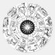 Roue zodiaque. Illustration vintage (plaque encyclopédique, graphique, art linéaire) de Larousse du XXème siècle 1932. Design noir et blanc. Sticker rond cool pour astrologues et astronomes.